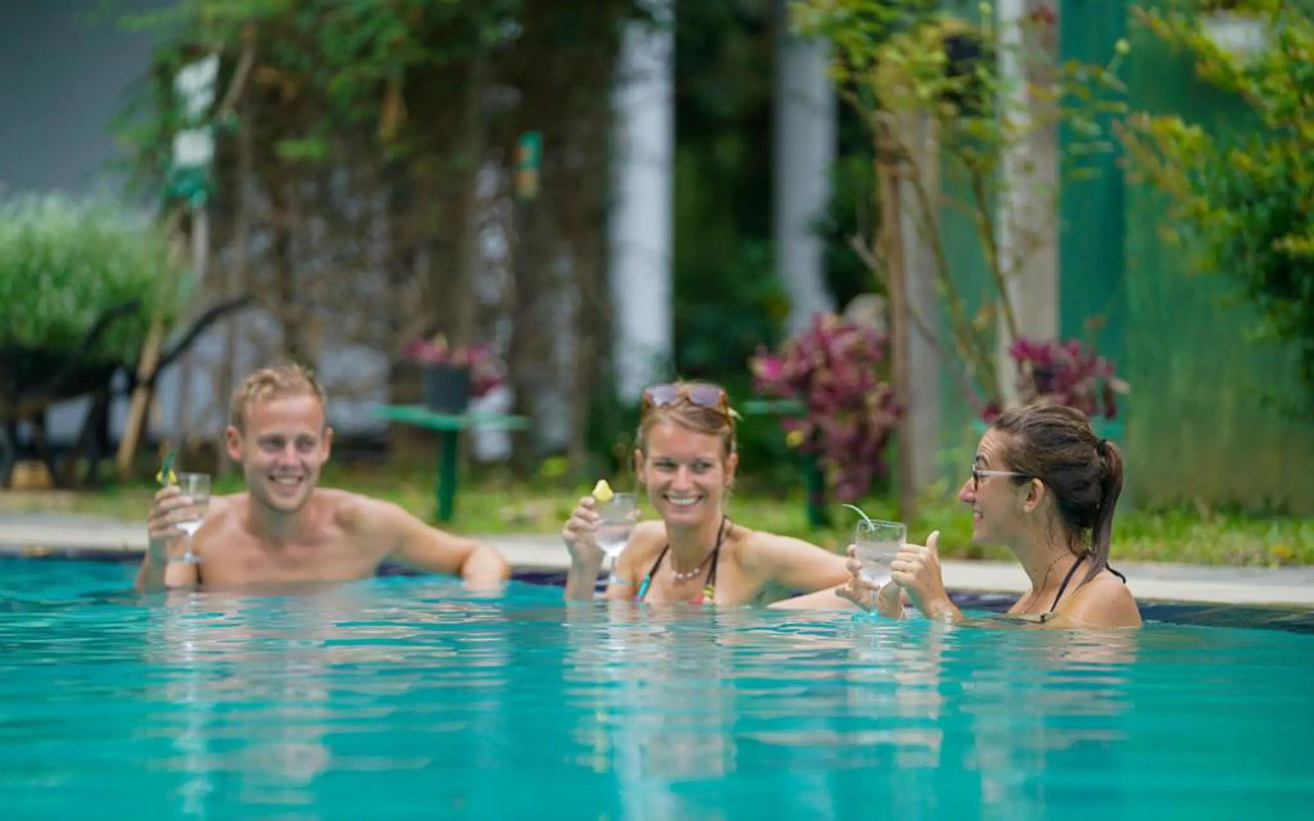 Rooms with variety & basic comforts — Rooms range from doubles to family rooms, some with garden or pool views. Common amenities include mosquito nets, wardrobes, tea/coffee facilities, and private bathrooms with hot/cold showers.